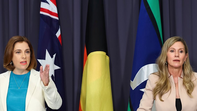 eSafety Commissioner Julie Inman Grant, pictured here with Communications Minister Anika Wells (left) at a press conference in November, said platforms weren’t assessed based on the harms they pose to children. Australia’s world-first ban is blocking platforms based on whether their “sole or significant purpose” is social interaction, which is why Roblox, for example, isn’t included despite safety concerns.Credit: Alex Ellinghausen